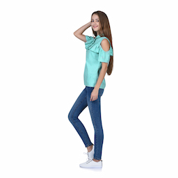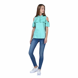 Add this light green, collared, cut-out sleeve top to your wardrobe and make a style statement in the next party you attend. The Label Bar has launched this regular short sleeve, ruffled top and Chambray fabricated top to suit your comfort requirements.
