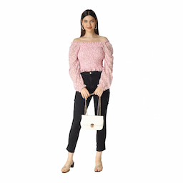 Floral Print off-shoulder pink top. This top is the finest choice for a day out in the city if you want a stylish yet relaxed look. You can Pair it with light blue denim and dramatic earrings for a gorgeous outfit. The model (height 5’7) is wearing a size Small. Georgette smocking fabric Preferably, Hand Wash. Wash with cold water iron on low heat setting.