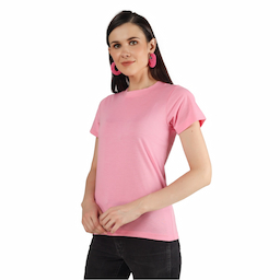 The t-shirt has short sleeves with a round neck and is a pure cotton blend. Solid Women Round Neck Baby Pink T-Shirt is easy to wash and is available in a range of sizes. Purchase this solid-fit T-shirt with little or no shaping at the waist. Choose The Label Bar round neck t-shirt this summer to maximize the comfort with a fashionable touch and step out in style